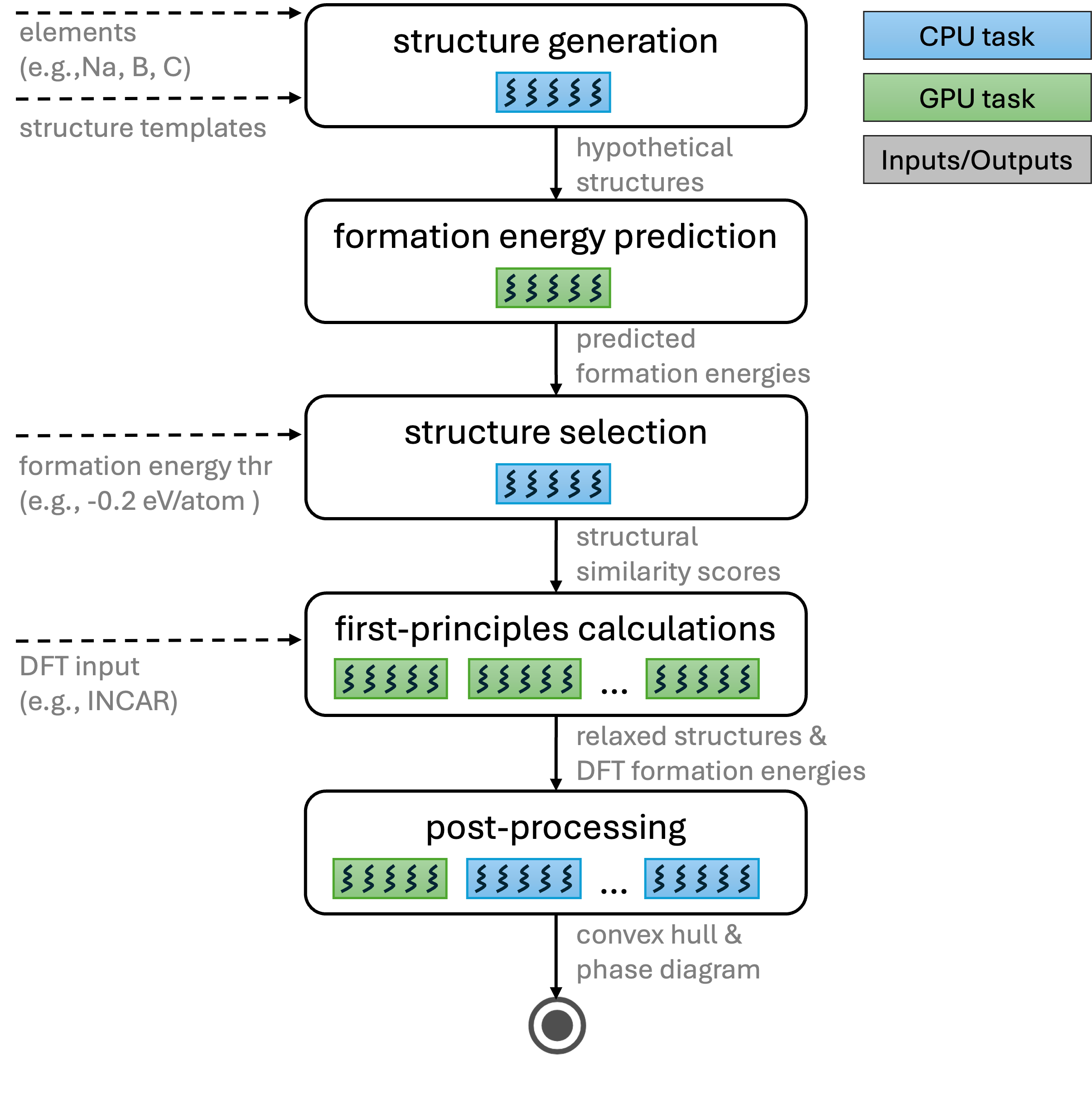 The filtered set of structures is subjected to first-principles calculations using Density Functional Theory (DFT) using VASP (extensible to other ab initio codes such as Quantum ESPRESSO).